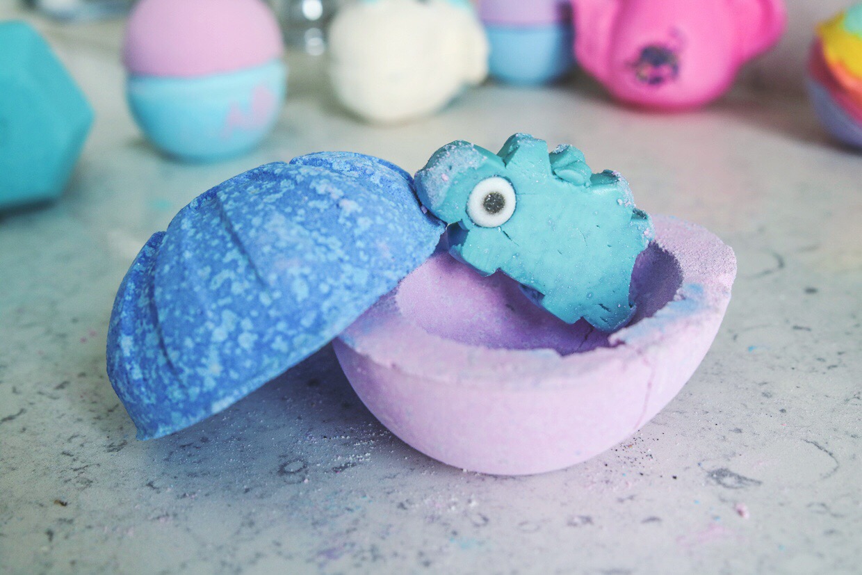 The bath bomb portion of this product was strawberry and peach scented while the Stegosaurus shaped fun had a creamy fruit scent that made me think of a less intense Starburst. I really enjoyed the colour of the bath art that this egg created, although I did find both halves to fizzle out pretty quick and probably wouldn’t have ended up with as much bath art had I not put in some bubble bath before hand. The final water colour was a beautiful shade of periwinkle.
