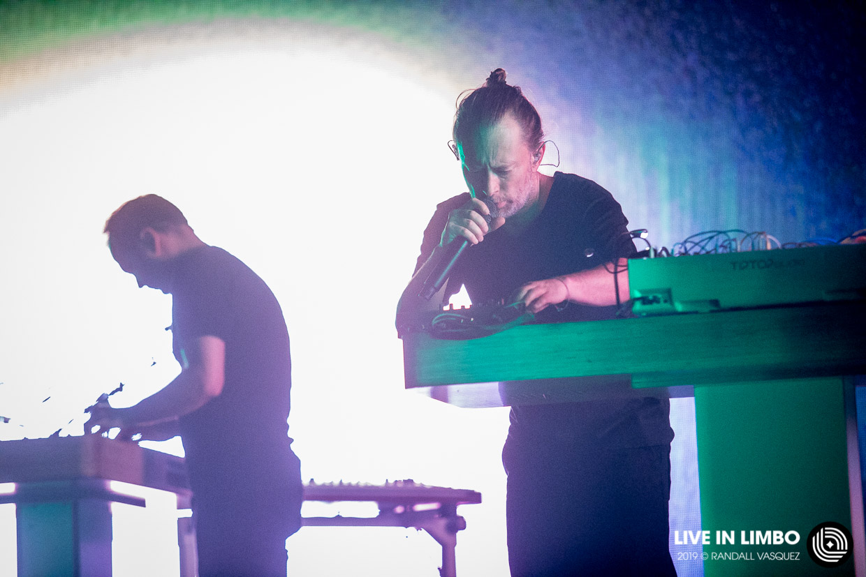 Almost like an apparition, Thom Yorke appears on stage accompanied by long-time album producer and collaborator Nigel Godrich and visual collaborator Tarik Barri. He walks to the front of the stage, bows to the crowd, and takes a seat at his keyboard to begin.
